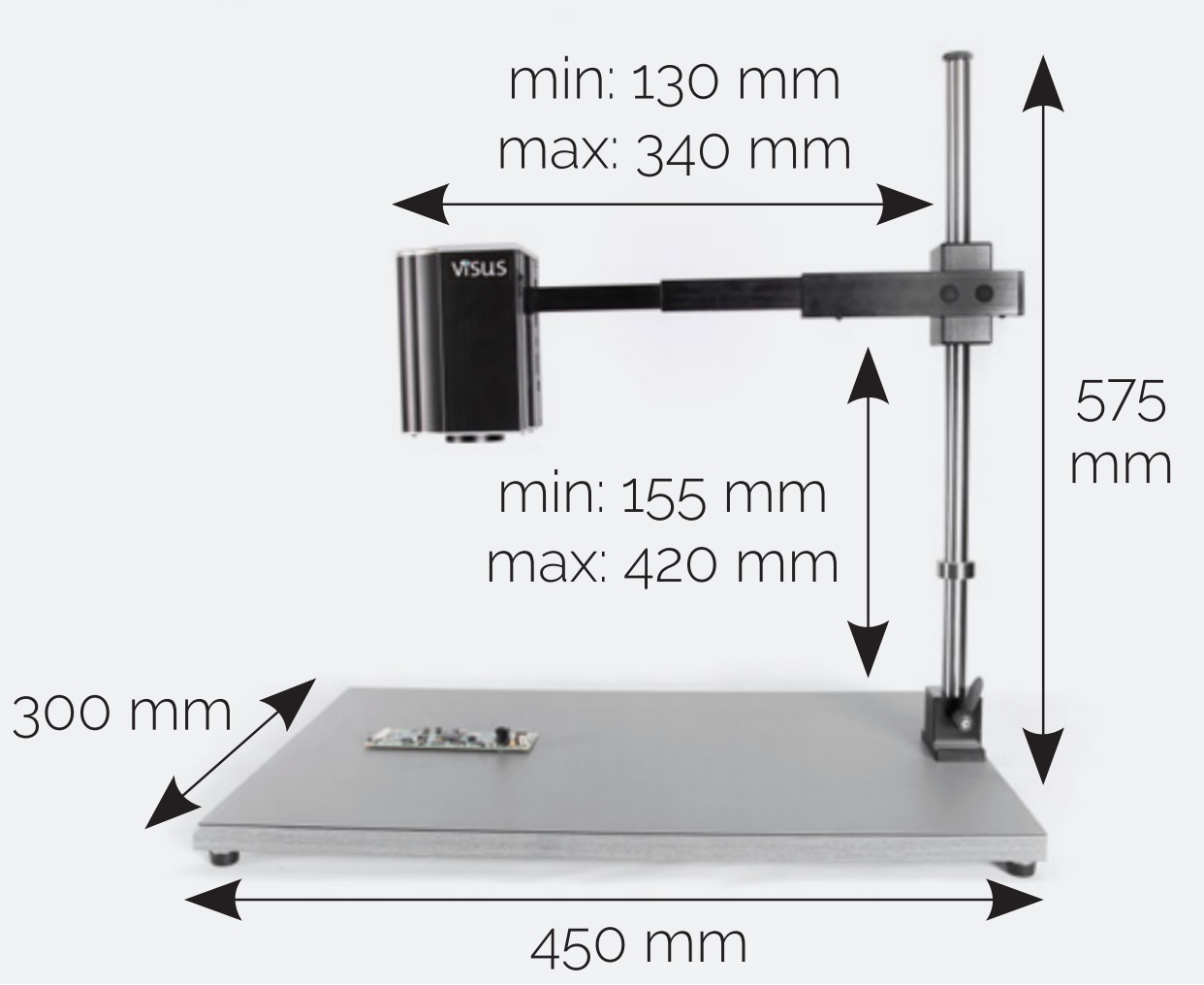 - W standardzie statyw posiada teleskopowe ramię umożliwiające wygodne i precyzyjne ustawianie położenia kamery w XY i Z. Statyw posiada również duży stolik roboczy którego powierzchnia pokryta jest materiałem ESD.